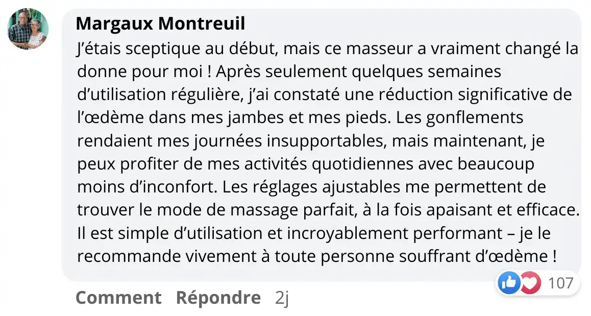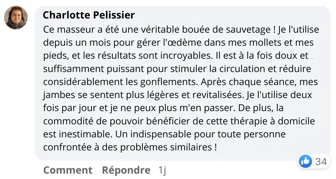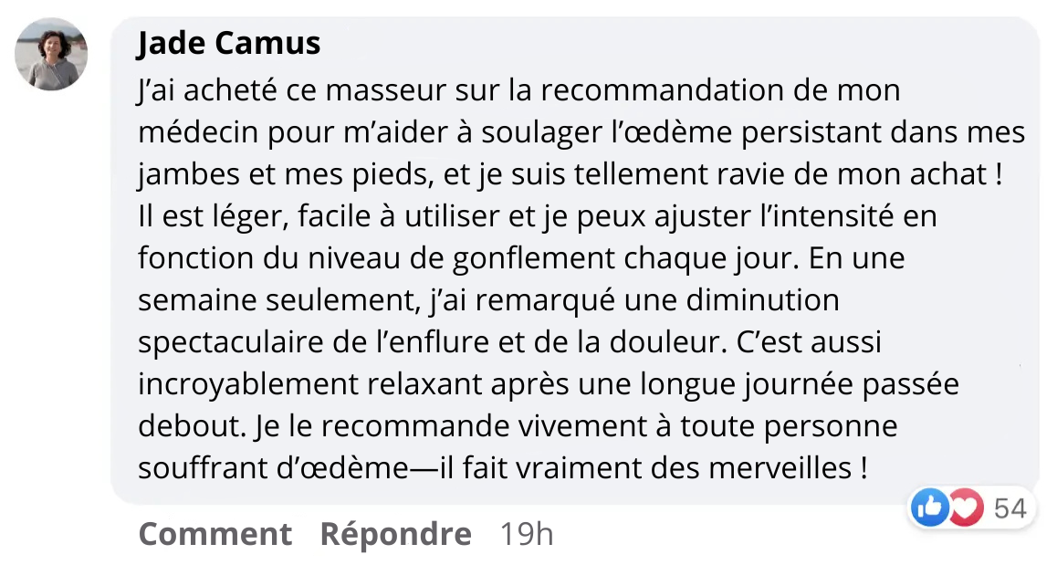 Ce masseur est bien plus puissant que ce à quoi je m’attendais. Il propose 18 niveaux d’intensité, et je n’ai pas pu dépasser le niveau 6. Dès la première utilisation, mes pieds et mes jambes picotaient déjà… Je ressentais une agréable sensation de stimulation. Il m’a enfin aidée à retrouver plus de confort après plusieurs mois de fatigue et de lourdeur aux pieds. Le masseur se plie facilement et se range dans un sac, ce qui me permet de l’emporter en voyage. Je l’adore !!😊